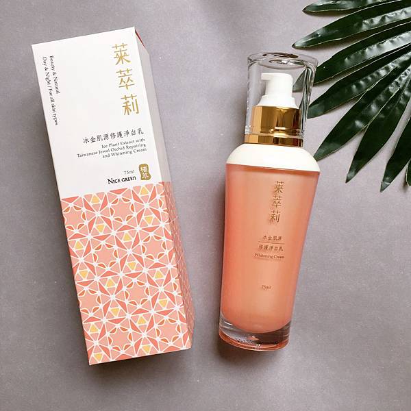 NICE GREEn萊萃莉的「冰金肌源修護淨白乳」含有冰花、金線蓮、辣木籽這三大植物萃取,能夠保濕修復、平衡油脂與代謝、調節滋養,沒有過度浮誇的香味,質地清爽不黏膩,非常好吸收。